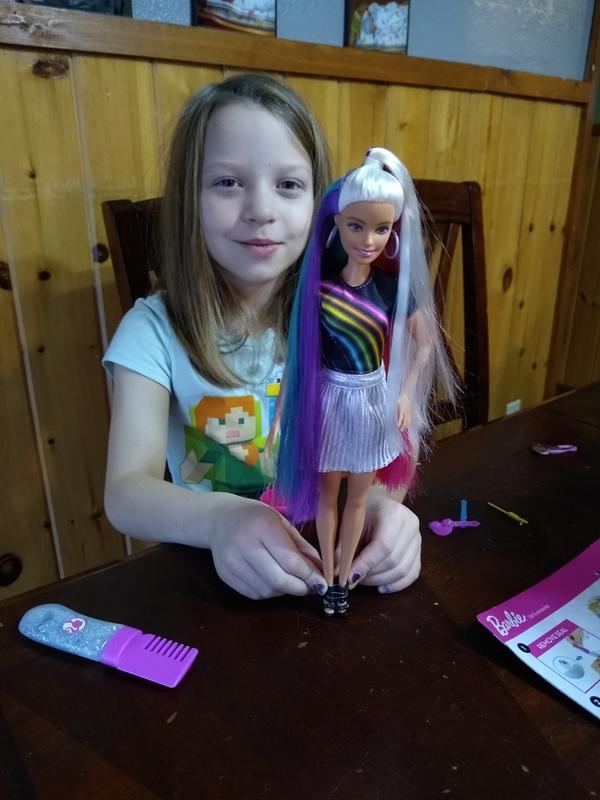 PNG. BarbieĀ® doll has long hair with a rainbow of color hidden underneath the long locks and a glitter comb to add sparkle. And her outfit matches with a rainbow graphic on her black shirt, a silvery skirt, black shoes and a pink bangle.