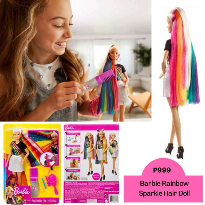 View Barbie Rainbow Hair Doll PNG. Barbie rainbow sparkle hair doll sparks young imaginations to design unique hairstyles with sparkle gel hair accessories and wow features! Barbie doll has long hair with a rainbow of color hidden underneath the long locks and a glitter comb to add sparkle.